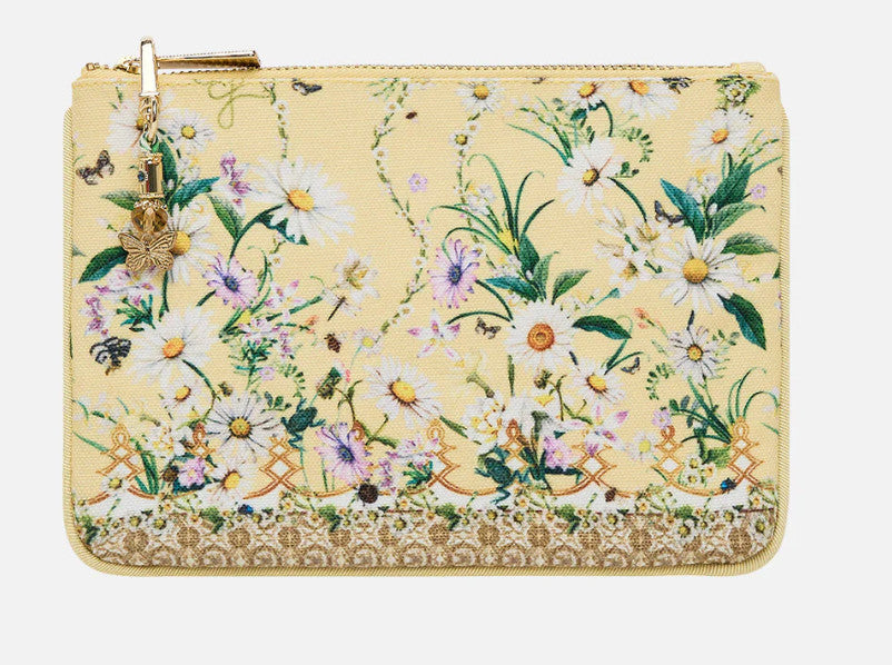 Designed in Australia, the Daisy Chains Coin And Phone Purse celebrates golden fields and sunlit days. Daisies and multi botanicals weave through textiles, lace and tapestries, telling a story of carefree wonder. Lovingly handcrafted, this purse showcases a stunning bespoke print and a streamlined rectangular silhouette with contrast piped edges. It features a secure zip-top closure and is finished with a custom CAMILLA parrot clip. Inside, the compartment is designed to keep your precious treasures stored in style.
