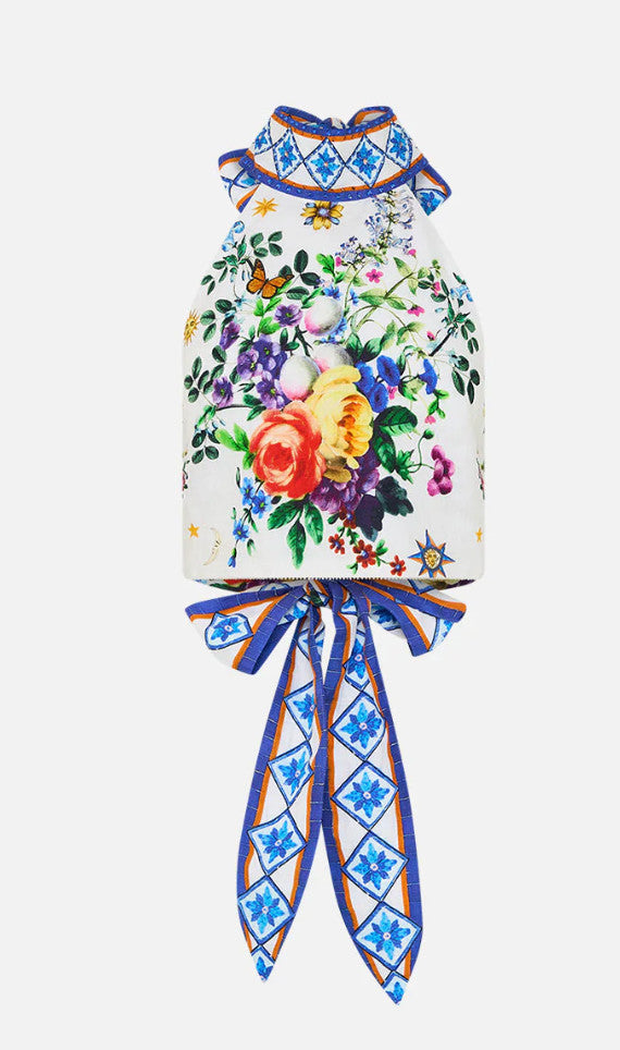 Designed in Australia, the Tiles Darls Halter Tie Back Top reads the language of florals and tiles, blue and orange hues intertwine, a celebration of artisan hands and enduring beauty. Lovingly handcrafted, this exquisite CAMILLA crop top features a sleek high neckline with generous back ties. The cropped length bodice is designed to be worn fitted with adjustable wide back ties creating a cinched silhouette.