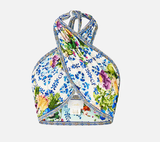 Designed in Australia, The Wall To Wall Wonders Tie Up Scarf Top captures the grandeur of Queluz Palace, with soft blues and golden yellows of Azulejo tiles, blending history and artistry in a panoramic view of Portugal’s timeless beauty. Lovingly handcrafted, this tie-up scarf top offers a sophisticated blend of versatility and elegance. The tie-up front creates an effortless, adjustable fit, while the stretch jersey fabric ensures comfort and fluidity.