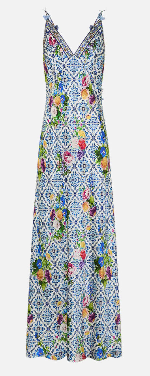 Designed in Australia, The Wall To Wall Wonders V Neck Full Length Bias Slip Dress captures the grandeur of Queluz Palace, with soft blues and golden yellows of Azulejo tiles, blending history and artistry in a panoramic view of Portugal’s timeless beauty. Lovingly handcrafted, this stunning CAMILLA silk maxi dress features a shaped panel bustline that falls into a skimming bodice, gently flaring into a maxi length hemline. The adjustable straps and deep V back neckline allow for a sleek silhouette with effortless allure.