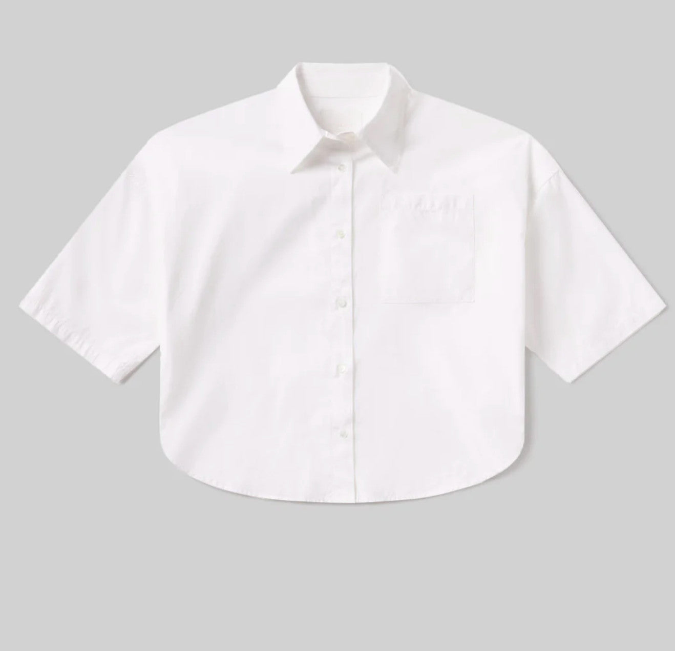 Looks Like: Clean white cropped button front collared short sleeve shirt