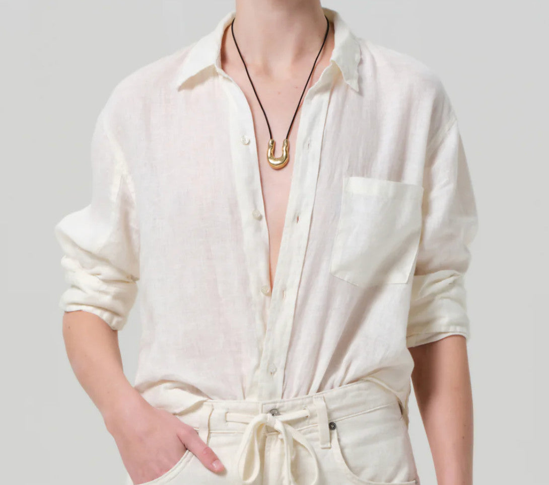 The Shrunken Kayla Shirt reimagines the classic button-down with a more tailored, cropped fit. Crafted from super lightweight linen, it’s ideal for layering over swim or pairing with your favorite travel pieces. The oversized silhouette is redefined with a high-low hem, adding a modern twist to this timeless staple. Versatile and effortlessly chic, it’s perfect for creating polished, laid-back looks year-round.