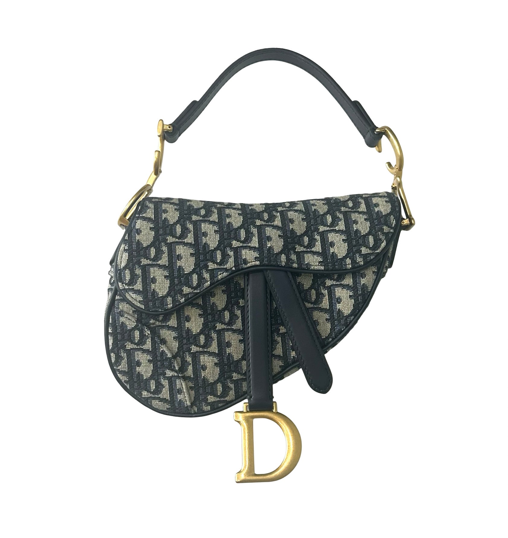 New Condition. Dior Mini Saddle Bag Blue Oblique Embroidery wih gold colored hardware. This bag has a magnetic flap over compartment with an exterior pocket located on the outside back side of the bag. This bag also includes an attachable crossbody strap, it has the signature Dior embroidery.