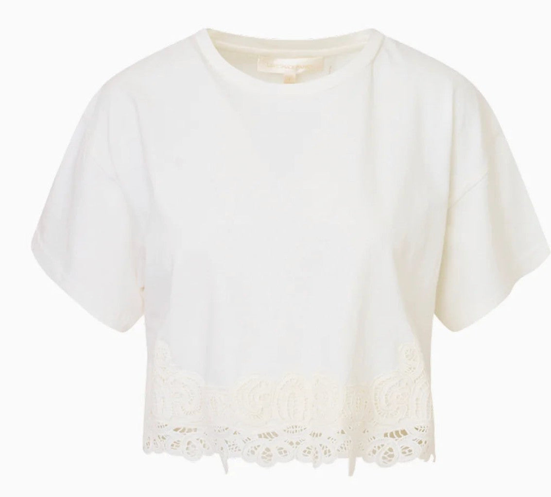 This Karolin Tee by LoveShackFancy is crafted from lightweight stretch jersey. It features a lace hem, crew neck, and short sleeves. It has a length of 18.5in / 47.0cm, from shoulder and is made of 100% cotton.