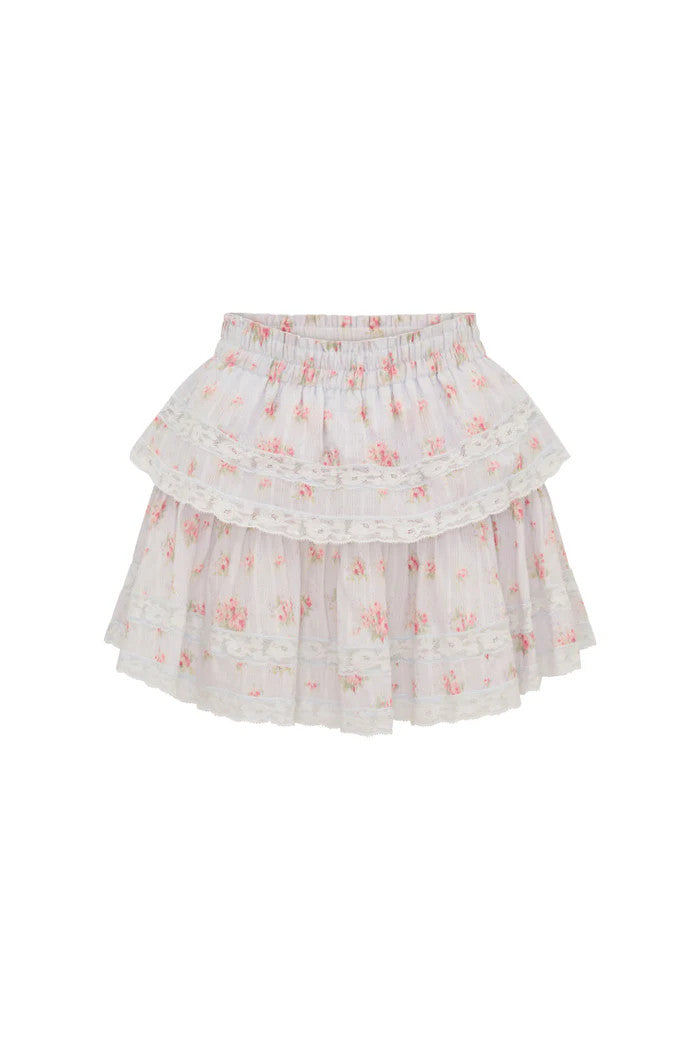 Our best-selling Ruffle Mini Skirt returns for the spring in an airy cotton with our charming ikat rose print all over. She features intricate inset lace trims and allover pintuck details. The elasticated waistband offers flexibility in comfort and styling. Tiered ruffles exude effortless femininity. The mini is finished with a frayed, raw hem for added playfulness.