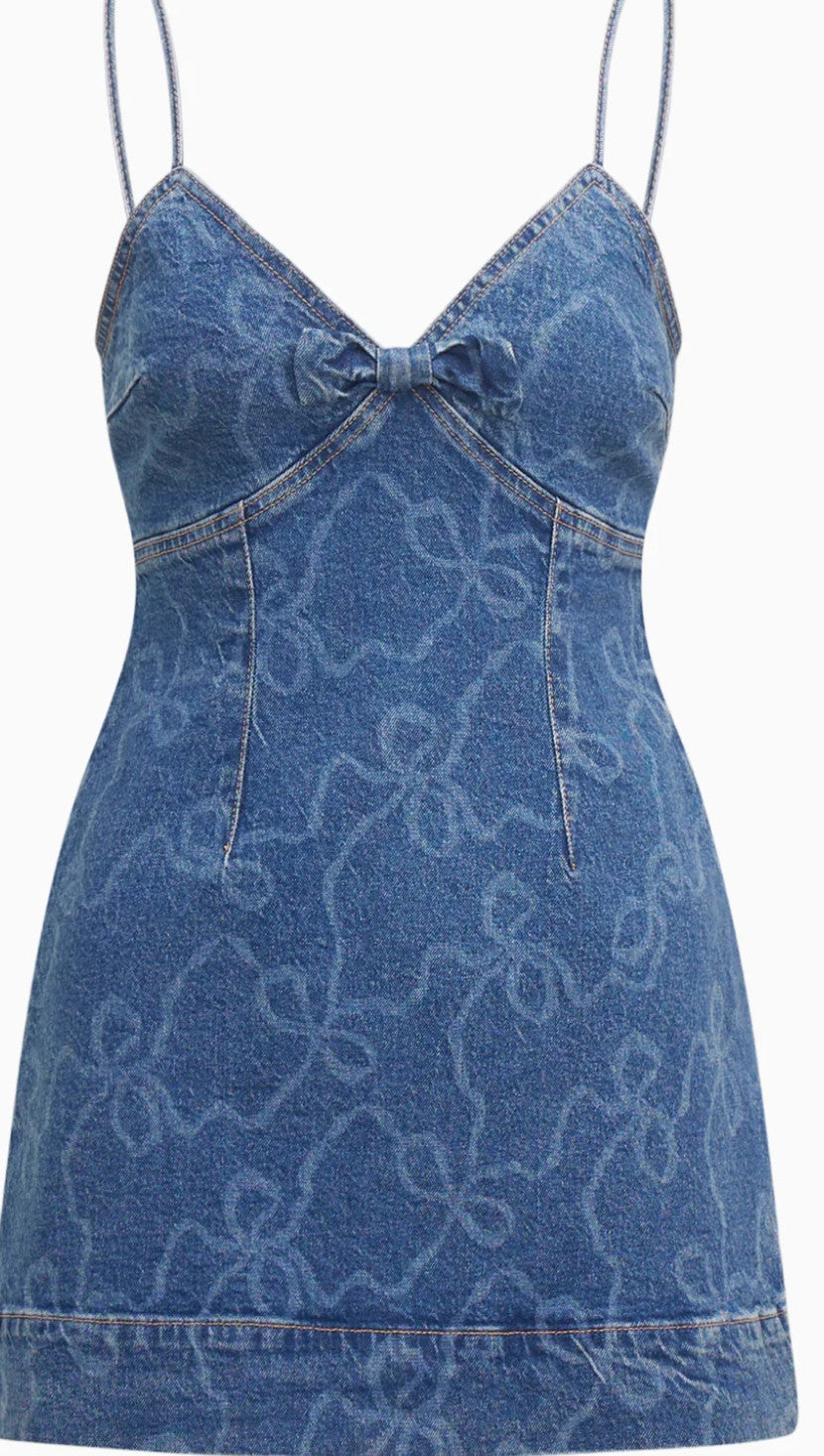 LoveShackFancy Solina Denim Bow Mini Dress Bow Chambray