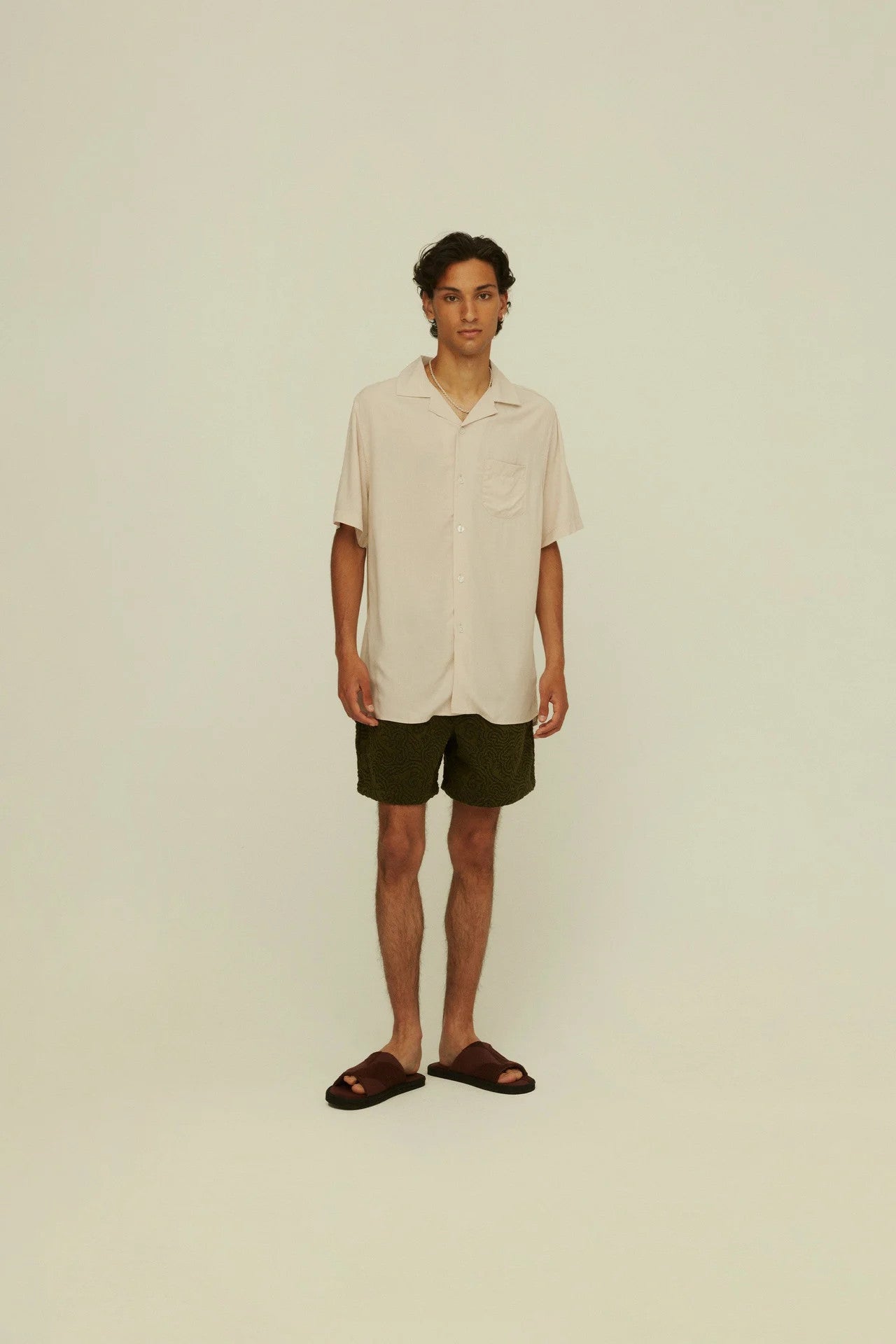 The Sand Plain viscose shirt is an easy-going fit with a resort collar that extends into a buttoned front. Tailored from a breezy viscose fabric characterized by a silky soft feel, ideal for warm-weather lounging.