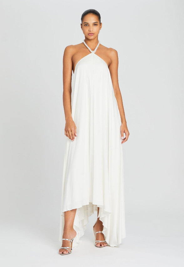 Embrace effortless elegance in our Maryam Dress. Featuring pearl embellishments around the neckline, an open back, a flowing silhouette and an asymmetrical hem, this floor-length dress is perfect for summer events or evening occasions. Feel confident and stylish in this timeless piece. Shown here in White.