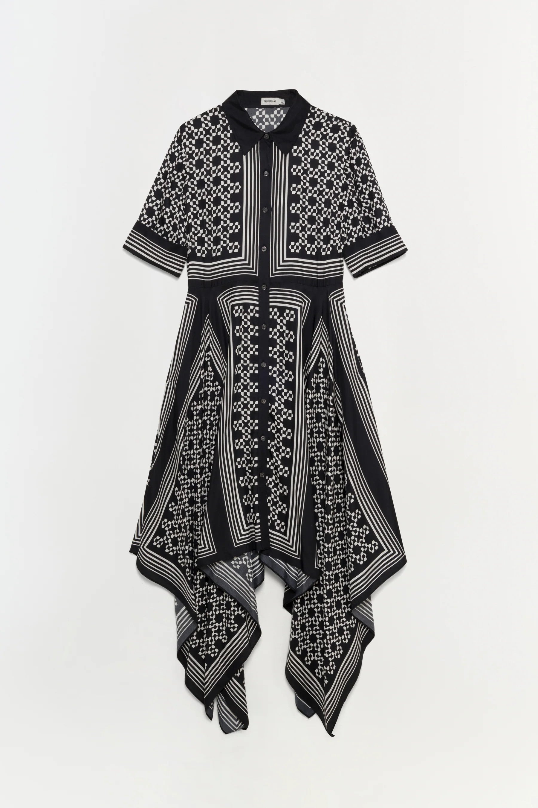 The Abrielle Midi Dress in Black. This short-sleeve handkerchief midi cover-up features a logo scarf print and is designed with a flowing silhouette and asymmetrical hem.