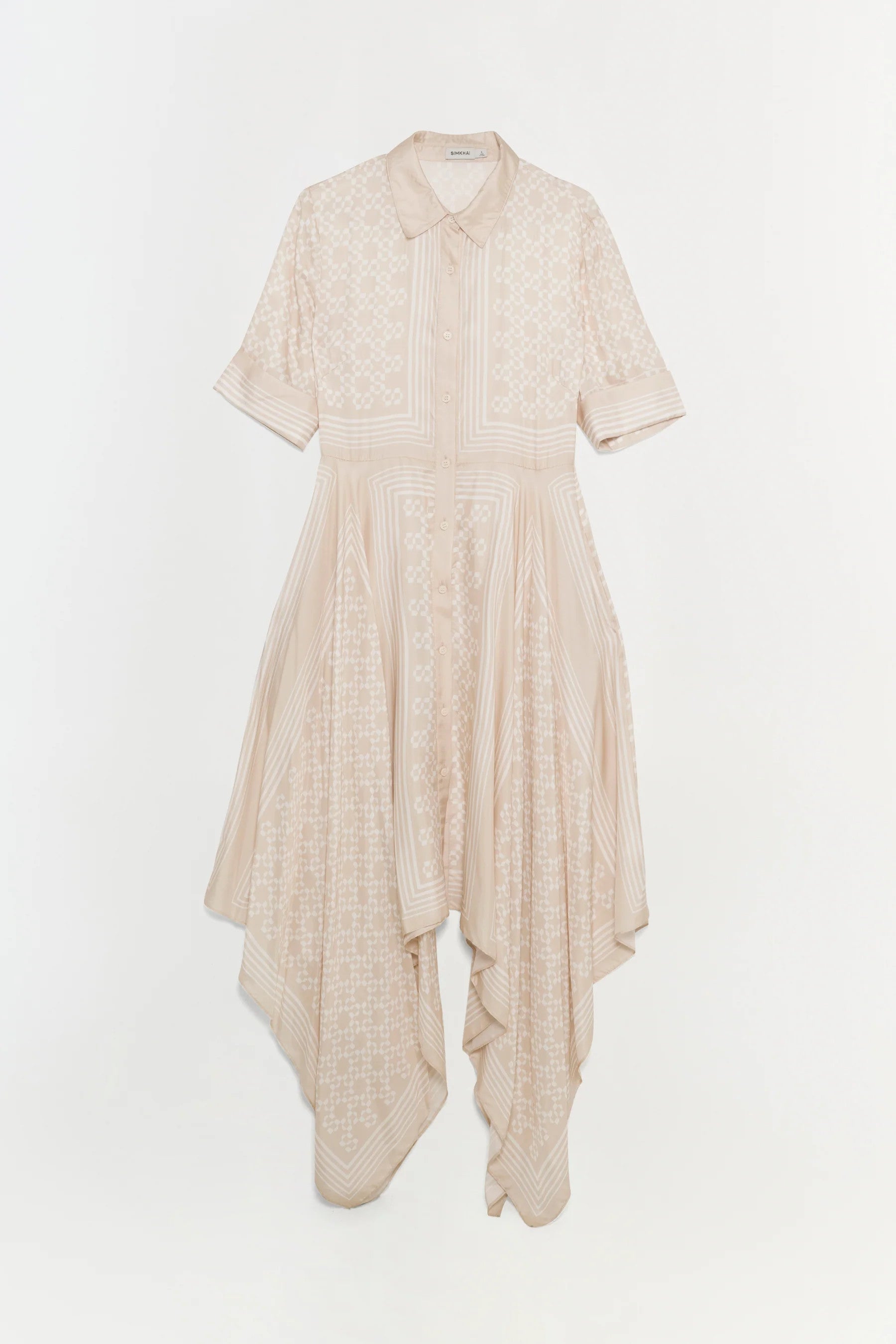The Abrielle Midi Dress in Sand. This short-sleeve handkerchief midi cover-up features a logo scarf print and is designed with a flowing silhouette and asymmetrical hem.