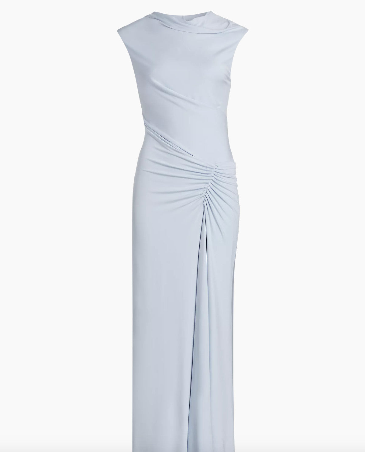 The Acacia Dress in Blue Haze. This sleeveless midi in draped jersey is crafted to create an effortlessly flattering silhouette, with elegant ruching that adds dimension and movement.