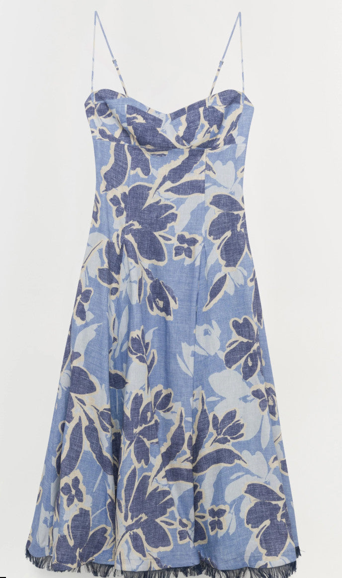 The Analise Linen Midi Dress in Blue Hydrangea Floral. This sleeveless bustier midi cover-up, crafted from floral-printed linen fabric, features a structured bodice and a flowing silhouette.