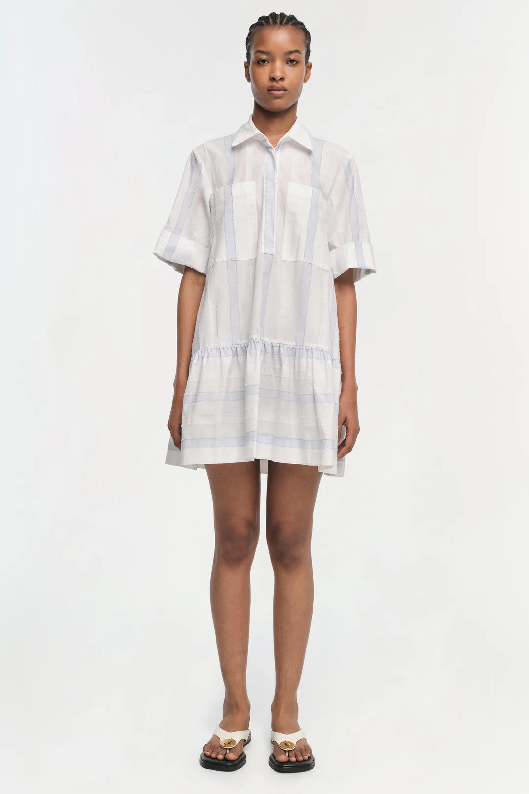 The Cris Dress in Blue Stripe Multi. Crafted from lightweight fabric, this charming top features a crisp white and soft blue striped pattern that evokes a fresh, summery feel. The shirt dress is designed with a traditional pointed collar and a button-down front that provides a classic touch, while the short sleeves add a casual, airy quality.