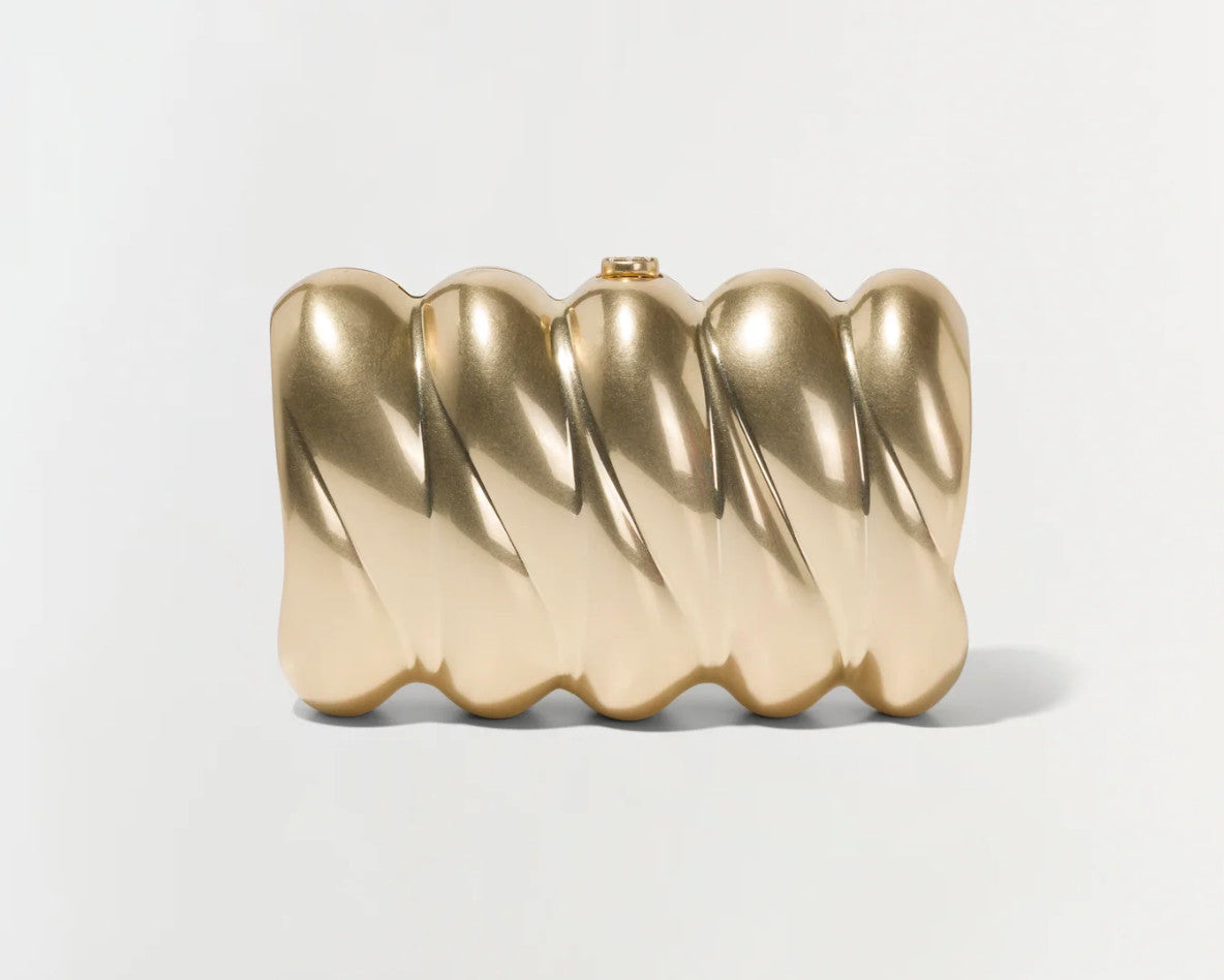 A handheld clutch that is solid in tone with a sculpted, jewelry-inspired design. Snap top closure.