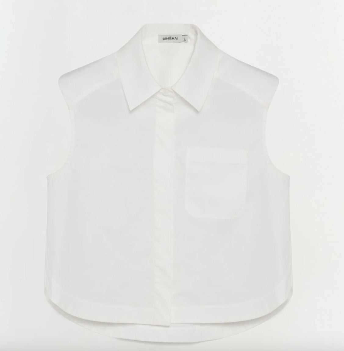 The Winslow Shirt in White. Crafted from crisp cotton poplin, this sleeveless cropped top offers a tailored yet effortless silhouette. Designed with clean lines and structured ease, it’s a modern staple for refined dressing.